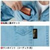 ●関連商品※76302ストレッチノータックカーゴパンツ●春夏用●素材:コーデュラストレッチデニム●混率:綿68%・ポリエステル16%・ナイロン14%・ポリウレタン2%[フロント]金属ファスナー[ポケット]樹脂ファスナー、[ボタン]金属ボタン●革ラベル(合成皮革)、左胸二重ポケット、ワンポイント(コーデュラ)、デザインボタン、プリント(内ポケット)、SS寸はレディース対応シルエットになります●サイズ:SS、S、M、L、LL、EL、4L、5L●カラー:インディゴ、クールブルー、ストロングブリーチ