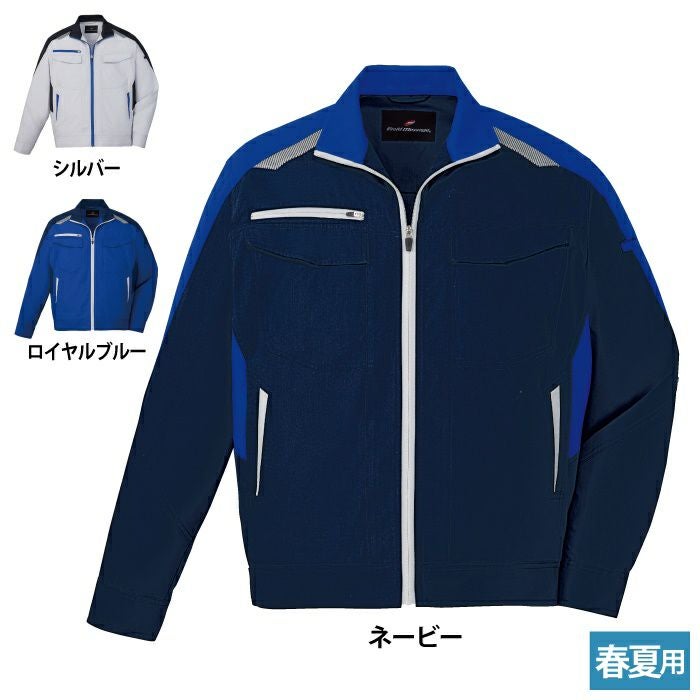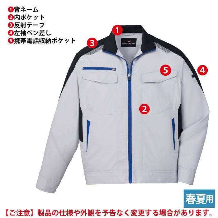 ●関連商品※87410抗ウイルス加工半袖ジャンパー※87404抗ウイルス加工長袖シャツ※87401抗ウイルス加工ノータックパンツ※87402抗ウイルス加工ノータックカーゴパンツ※87406抗ウイルス加工レディースパンツ(裏付)※87416抗ウイルス加工レディースカーゴパンツ(裏付)●春夏用●素材:バリエックスポプリン●混率:ポリエステル65%・綿35%[フロント]樹脂ファスナー[ポケット]樹脂ファスナー、[ボタン]樹脂ボタン●背ネーム、内ポケット、反射テープ、左袖ペン差し、携帯電話収納ポケット、SS寸はレディース対応シルエットになります●サイズ:SS、S、M、L、LL、EL、4L、5L●カラー:ネービー、シルバー、ロイヤルブルー
