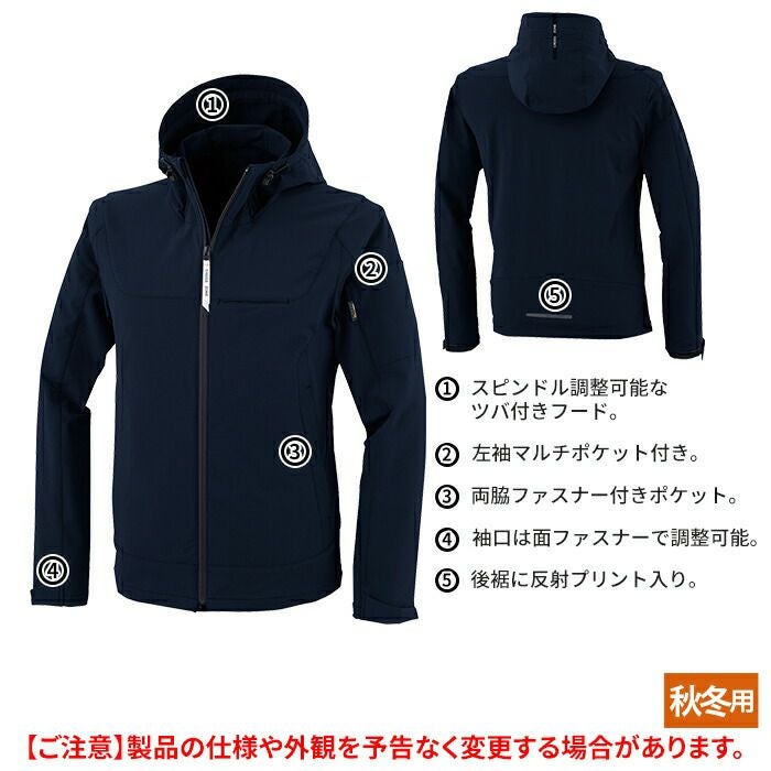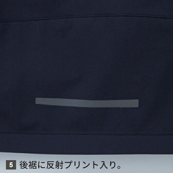 ◇機能:スピンドル調整可能なツバ付きフード、左袖マルチポケット付き、両脇ファスナー付きポケット、袖口は面ファスナーで調整可能、後裾に反射プリント入り