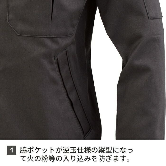◇ブルゾン前面、フラップ、袖口は糸付けボタンを隠す仕様で、火熱を扱う現場での火花・スパッタがあたりにくく、他のモノが傷付かない安心・安全設計