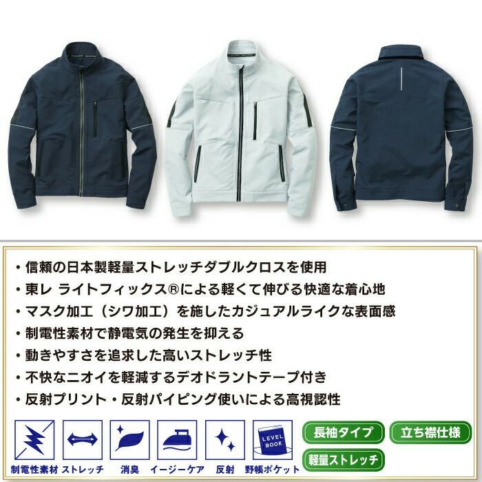 ◇機能:反射プリント、胸ファスナーポケット、胸ポケット(野帳が入る)、ドットボタン(隠し)、ロゴ入りラインテープ、袖ペン差し、反射パイピング、デオドラントテープ