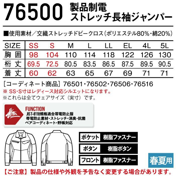 自重堂 Z-DRAGON 作業服 作業着 作業ズボン 自重堂 Z-DRAGON 作業服 76500 製品制電ストレッチ長袖ジャンパー 4L-5L 春夏用 作業着