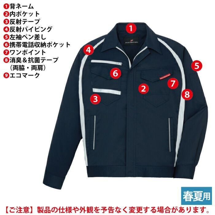 ◇機能:背ネーム・内ポケット・反射テープ・反射パイピング・左袖ペン差し・携帯電話収納ポケット・ワンポイント・消臭抗菌テープ(両脇・両肩)・エコマーク・野帳対応
