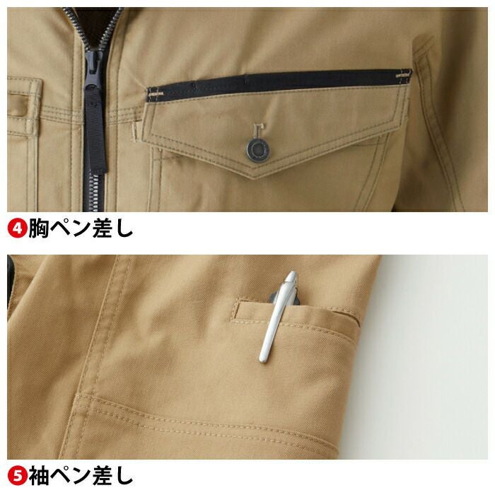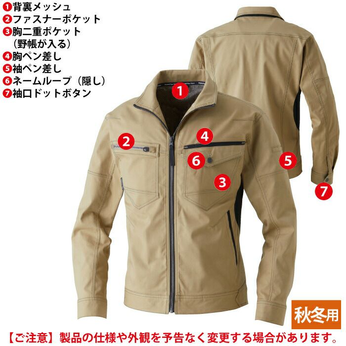 ◇機能:制電性素材・ストレッチ・消臭・イージーケア・レディース対応・背裏メッシュ・ファスナーポケット・胸二重ポケット(野帳が入る)・胸ペン差し・袖ペン差し・袖口ドットボタン