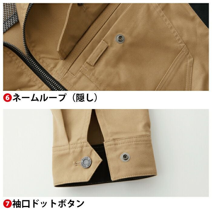 ◇機能:制電性素材・ストレッチ・消臭・イージーケア・レディース対応・背裏メッシュ・ファスナーポケット・胸二重ポケット(野帳が入る)・胸ペン差し・袖ペン差し・袖口ドットボタン