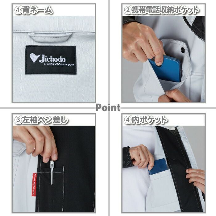 ◇機能:背ネーム・内ポケット・ワンポイント・ウイングアーム2(自重堂オリジナル仕様)・ファスナーポケット・左袖ペン差し・携帯電話収納ポケット・消臭抗菌テープ(両脇・両肩)・樹脂ファスナー(フロント・ポケット)・樹脂ボタン・野帳対応