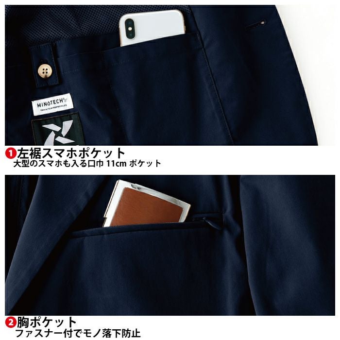 ◇機能:撥水・大型スマホも入る口幅11センチポケット・ファスナー付きでもの落下防止の胸ポケット・脇部分には隠しファスナー付きでモノ落下防止ポケット・袖口はボタンで開閉。手洗い時にも便利。左胸・右胸の両玉内ポケット。右裾ファスナー付き大型ポケット