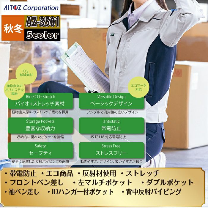 ◇機能:フロントペン差し・左マルチポケット・ダブルポケット・袖ペン差し・IDハンガー付ポケット・背中反射パイピング・裾ドットボタン付・JIST8118適合帯電防止・エコマーク対応