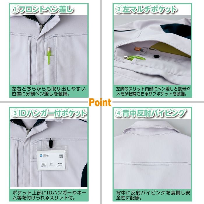 ◇機能:フロントペン差し・左マルチポケット・ダブルポケット・袖ペン差し・IDハンガー付ポケット・背中反射パイピング・裾ドットボタン付・JIST8118適合帯電防止・エコマーク対応