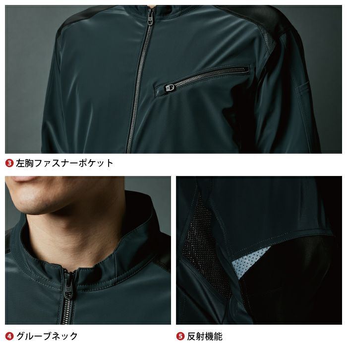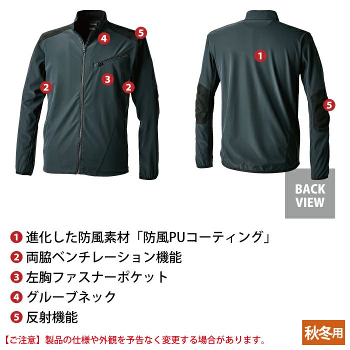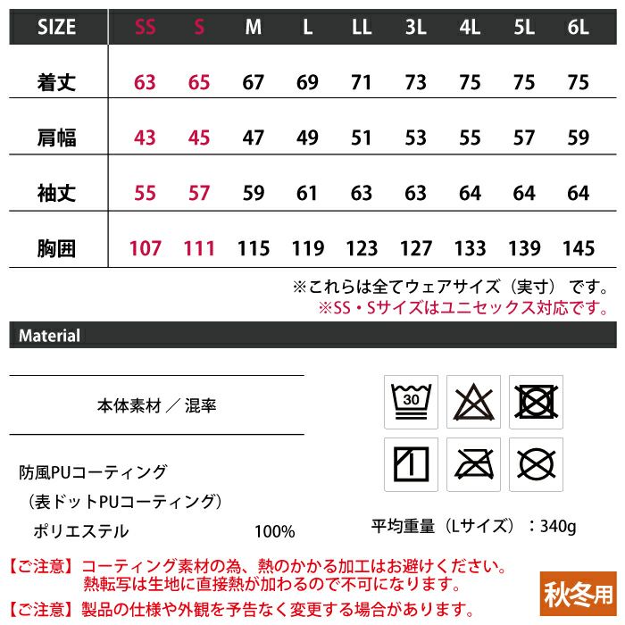 ◇機能:PUコーティングによる防風性・軽量性・反射材(両肩・両肘)・両脇ベンチレーションニット・左胸ファスナーポケット・グルーブネック仕様・ストレッチバインダー仕様(袖口・裾後ろ)・両脇ポケット・ストレッチ・左袖ペン差しポケット付き