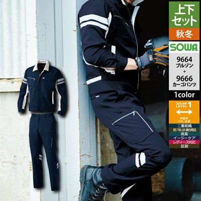 桑和 SOWA 作業服 上下セット 秋冬用 9664 長袖ブルゾン(反射材付き)SS-3L と 9666 カーゴパンツ(反射材付き) GS-100 作業着 作業ズボン