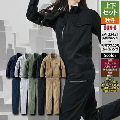サンエス 作業服 上下セット SPT22421 長袖ブルゾンM-3L と SPT22425 カーゴパンツ 3S-3L 秋冬 作業ズボン 作業着