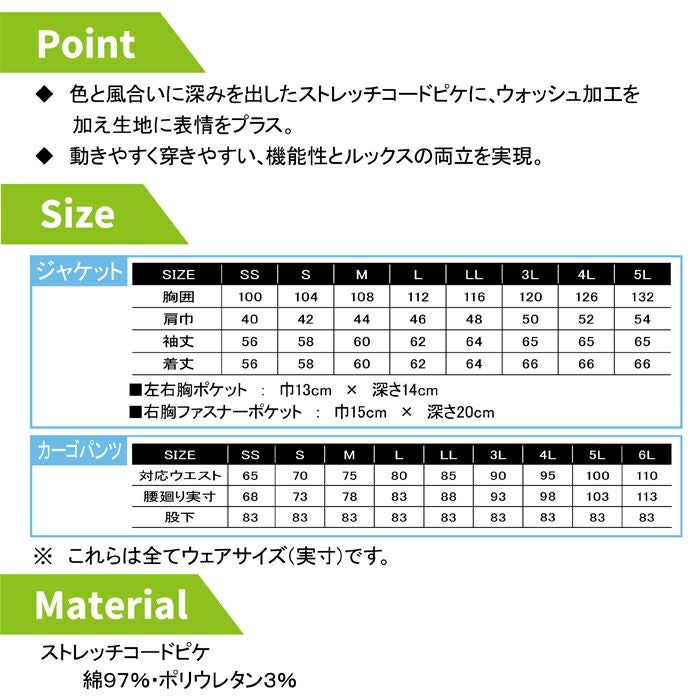コーコス 作業服 作業着 作業ズボン コーコス 作業服 オールシーズン 上下セット GA-3910 ストレッチコードピケジャケットM-3L と GA-3915 ストレッチコードピケカーゴパンツ SS-3L