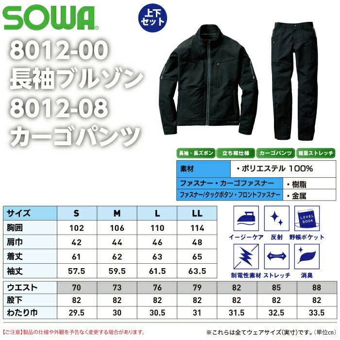 作業服 作業着 SOWA ブルゾン 秋冬用 作業服 上下セット SOWA 8012-00 長袖ブルゾンS-LL と 8012-08 カーゴパンツ 70-88 秋冬用 かっこいい おしゃれ 作業着 ズボン