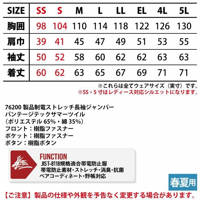 自重堂 Z-DRAGON 作業服 作業着 作業ズボン 自重堂 Z-DRAGON 作業服 76200 製品制電ストレッチ長袖ジャンパー 4L-5L 春夏用 作業着
