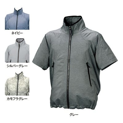 ●関連商品※7059-00長袖ブルゾン(サイクロンエアー)※7059-06ベスト(サイクロンエアー)●春夏用●素材:ポリエステル100% ●空調、UVカット(UPF 50+)、イージーケア、撥水/水をはじく、<トールカラー>より頭部に近いところまで涼感を届ける。<エアースルーネック>風を集めて首元から勢いよく出すことで涼しく爽やかな着心地。<風洞メッシュ>風の通りをよくするメッシュ素材を使用。保冷剤を入れてファンを回せばさらに快適。<ウエスト調整ドローコード>ウエスト部分の通気も調節が可能。<バッテリーポケット>着たまま外側から調節できるので便利。<ラインホルダー>コードが作業の邪魔にならないホルダー付き。●サイズ:M(胸囲/120、肩幅/52、着丈/74、袖丈/20)、L(胸囲/124、肩幅/54、着丈/76、袖丈/22)、LL(胸囲/128、肩幅/56、着丈/78、袖丈/24)、3L(胸囲/132、肩幅/58、着丈/80、袖丈/25)、4L(胸囲/138、肩幅/60、着丈/82、袖丈/25)、6L(胸囲/146、肩幅/64、着丈/82、袖丈/25)●カラー:ネイビー、グレー、シルバーグレー、カモフラグレー