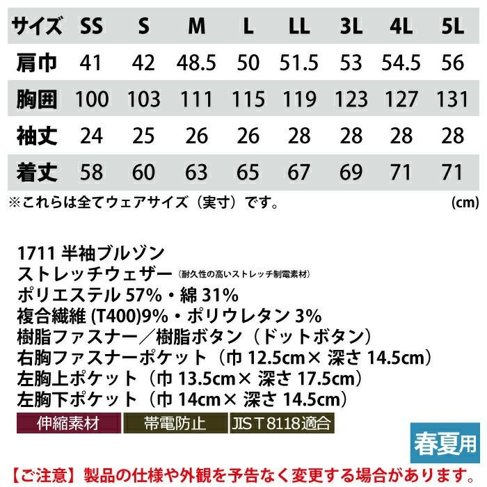 ジーベック XEBEC 作業服 春夏用 1711 半袖ブルゾン SS-LL 作業着