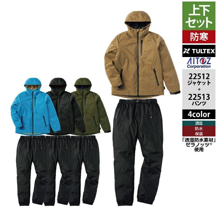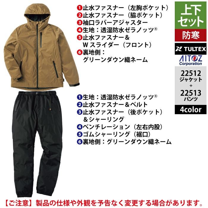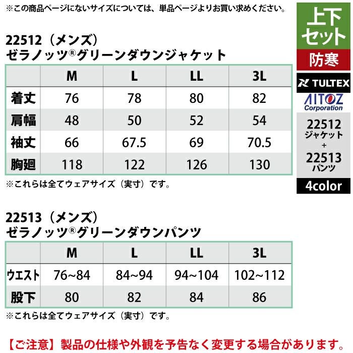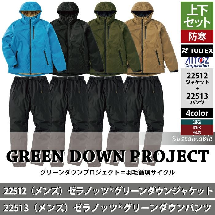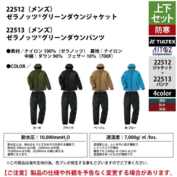 アイトス Aitoz 作業服 作業着 作業ズボン アウトドア 秋冬用 アイトス Aitoz 上下セット 22512 ゼラノッツダウンジャケット M-3L と 22513 ゼラノッツグリーンダウンパンツ M-3L 作業着
