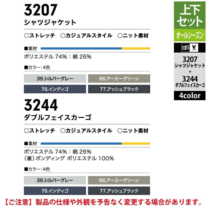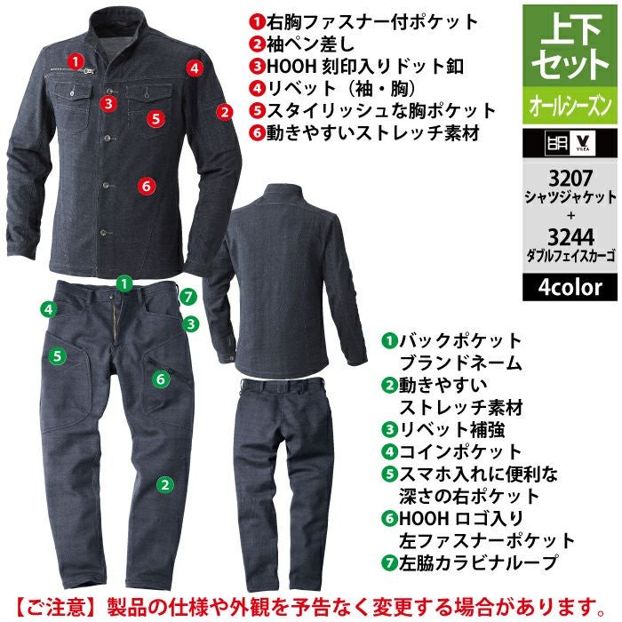 村上被服 HOOH 鳳凰 作業服 作業着 村上被服 HOOH 鳳凰 作業服 上下セット 3207 シャツジャケットM-3L と 3244 ダブルフェイスカーゴ SS-3L 作業着 作業ズボン