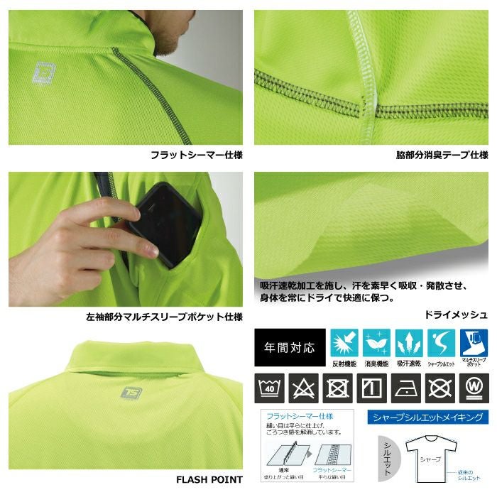 ●関連商品※3085スマートネックシャツ※3065半袖ポロシャツ※3075長袖ポロシャツ※3015ショートスリーブハーフジップ※3025ロングスリーブハーフジップ●オールシーズン用●素材:ドライメッシュ ポリエステル100%●反射機能、消臭機能、吸汗速乾、シャープシルエット、マルチスリーブポケット、フラットシーマー仕様、脇部分消臭テープ仕様、左袖部分マルチスリーブポケット仕様●サイズ:SS(着丈/62、胸囲/91、裄丈/77)、S(着丈/64、胸囲/96、裄丈/79)、M(着丈/68、胸囲/101、裄丈/81)、L(着丈/70、胸囲/106、裄丈/83)、LL(着丈/72、胸囲/111、裄丈/85)、3L(着丈/74、胸囲/116、裄丈/87)、4L(着丈/76、胸囲/124、裄丈/88)、5L(着丈/78、胸囲/132、裄丈/89)、6L(着丈/80、胸囲/140、裄丈/91)●カラー:ホワイト、チャコールグレー、ロイヤルブルー、ネイビー、ライトグリーン、ワイン、ブラック