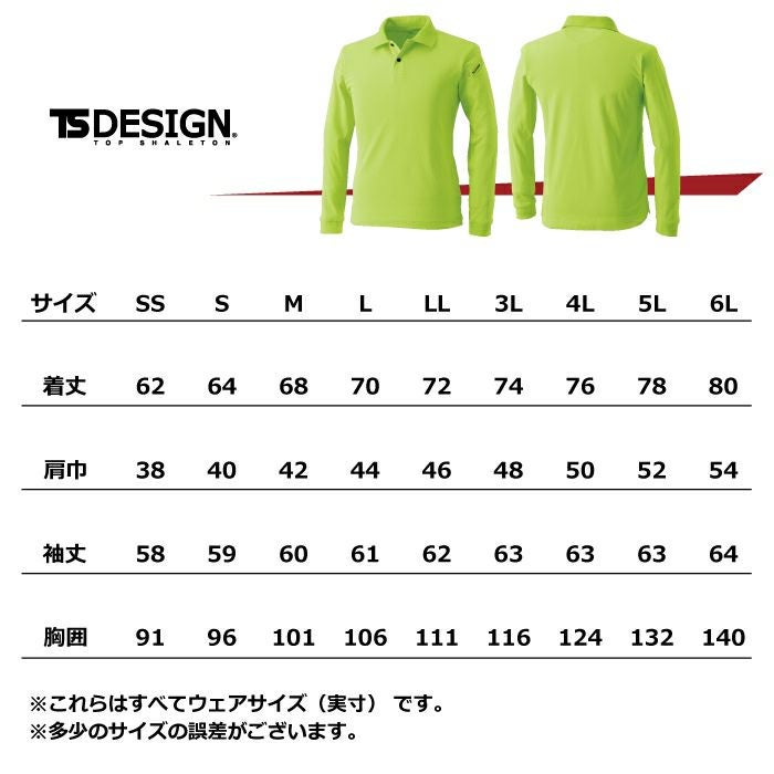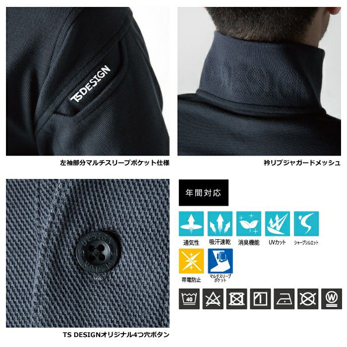 ●関連商品※4065ショートスリーブポロシャツ※4075ロングスリーブポロシャツ●オールシーズン用●素材:ESドライ鹿の子(導電繊維混入) ポリエステル70% 綿30%●通気性、吸汗速乾、消臭機能、UVカット、シャープシルエット、帯電防止、マルチスリーブポケット、左袖部分マルチスリーブポケット仕様、衿リブジャガードメッシュ(TS AIR FLOW SYSTEM)、TS DESIGNオリジナル4つ穴ボタン●サイズ:SS(着丈/62、肩巾/38、袖丈/58、胸囲/91)、S(着丈/64、肩巾/40、袖丈/59、胸囲/96)、M(着丈/68、肩巾/42、袖丈/60、胸囲/101)、L(着丈/70、肩巾/44、袖丈/61、胸囲/106)、LL(着丈/72、肩巾/46、袖丈/62、胸囲/111)、3L(着丈/74、肩巾/48、袖丈/63、胸囲/116)、4L(着丈/76、肩巾/50、袖丈/63、胸囲/124)、5L(着丈/78、肩巾/52、袖丈/63、胸囲/132)、6L(着丈/80、肩巾/54、袖丈/64、胸囲/140)●カラー:ホワイト、チャコールグレー、ロイヤルブルー、ネイビー、ライトグリーン、ワイン、ブラック