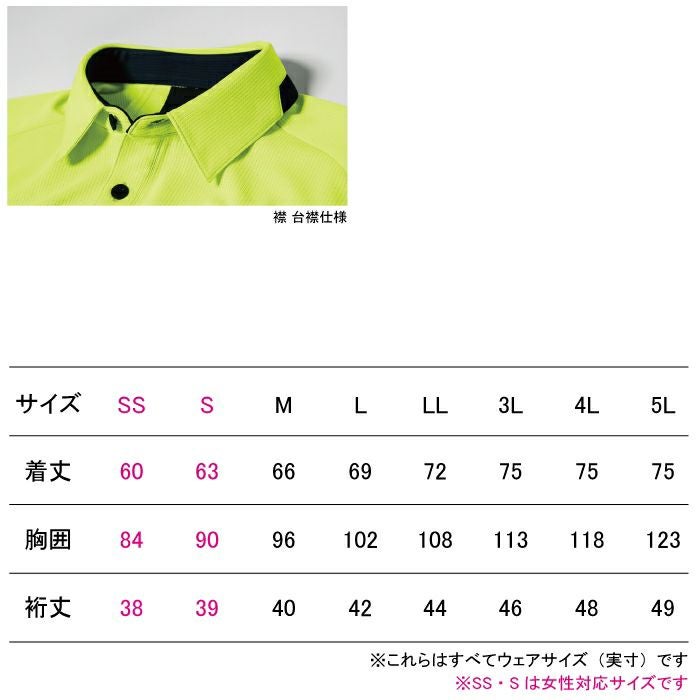 ●関連商品※6195長袖ポロシャツ●春夏用●素材:ワッフル ポリエステル100%、樹脂ボタン(糸付ボタン)●紫外線カット、吸汗性抜群、速乾性抜群、消臭機能付き、さらっとした肌触りと吸汗速乾性、胸ポケット(巾9.5cm×深さ11cm)●サイズ:SS(裄丈/38、胸囲/84、着丈/60)、S(裄丈/39、胸囲/90、着丈/63)、M(裄丈/40、胸囲/96、着丈/66)、L(裄丈/42、胸囲/102、着丈/69)、LL(裄丈/44、胸囲/108、着丈/72)、3L(裄丈/46、胸囲/113、着丈/75)、4L(裄丈/48、胸囲/118、着丈/75)、5L(裄丈/49、胸囲/123、着丈/75)●カラー:コン、シルバーグレー、ブルー、オレンジ、イエローグリーン、クロ