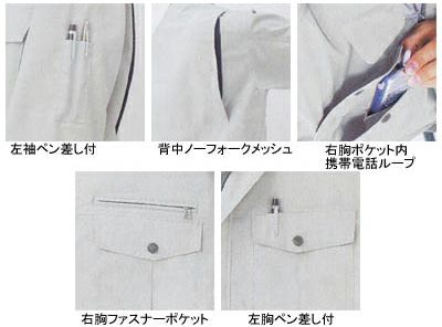 ●機能:左袖ペン差し付、背中ノーフォークメッシュ、右胸ポケット内携帯電話ループ、右胸ファスナーポケット、左胸ペン差し付