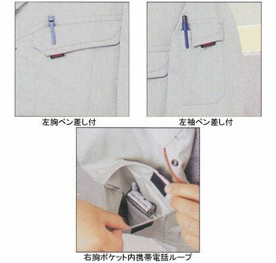 ●機能:左胸ペン差し付、左袖ペン差し付、右胸ポケット内携帯電話ループ