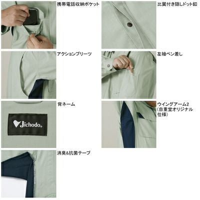 ●関連商品※86400難燃長袖ブルゾン※86404難燃長袖シャツ※82420難燃続服(年間定番生地使用)●春夏用●素材/ブレバノプラスポプリン 綿55%アクリル系45%●携帯電話収納ポケット、アクションプリーツ、左袖ペン差し、背ネーム、ウイングアーム2(自重堂オリジナル仕様)、比翼付き隠しドット釦、消臭&抗菌テープ●サイズ:S(首廻/41、胸囲/106、肩幅/45、袖丈/55.5、着丈/71)、M(首廻/42、胸囲/110、肩幅/47、袖丈/57.5、着丈/73)、L(首廻/43、胸囲/114、肩幅/49、袖丈/59.5、着丈/75)、LL(首廻/44、胸囲/118、肩幅/51、袖丈/61.5、着丈/78)、EL(首廻/45、胸囲/122、肩幅/53、袖丈/62.5、着丈/78)、4L(首廻/47、胸囲/126、肩幅/55、袖丈/62.5、着丈/80)、5L(首廻/49、胸囲/130、肩幅/57、袖丈/62.5、着丈/81)●カラー:ネイビー、アースグリーン、ダークブルー