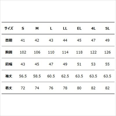 ●関連商品※56400ジャンパー※56404長袖シャツ※56402ノータックカーゴパンツ●春夏用●素材/ダブルフェイスクロス ポリエステル60%綿40%●背当プリント●右胸ポケットファスナーロゴ入りスライダー●デザインボタン(大)●デザインボタン(小)●左袖ペン差し●消臭&抗菌テープ(両脇・両肩)●革ラベル(人工皮革)●サイズ:S(首廻/41、胸囲/102、肩幅/43、袖丈/56.5、着丈/72)、M(首廻/42、胸囲/106、肩幅/45、袖丈/58.5、着丈/74)、L(首廻/43、胸囲/110、肩幅/47、袖丈/60.5、着丈/76)、LL(首廻/44、胸囲/114、肩幅/49、袖丈/62.5、着丈/78)、EL(首廻/45、胸囲/118、肩幅/51、袖丈/63.5、着丈/80)、4L(首廻/47、胸囲/122、肩幅/53、袖丈/63.5、着丈/82)、5L(首廻/49、胸囲/126、肩幅/55、袖丈/63.5、着丈/82)●カラー:インディゴ、キャメル、ブラック、ワイン