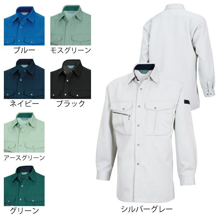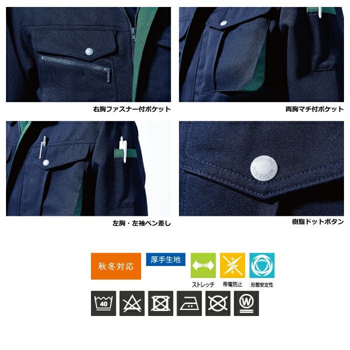 ●関連商品※7116長袖ブルゾン※7113カーゴパンツ※7115長袖シャツ※7111スラックス※7211ノータックスラックス●秋冬用●素材:ストレッチツイル(導電繊維混入) ポリエステル100%●ストレッチ、帯電防止、形態安定性、厚手生地、右胸ファスナー付ポケット、両胸マチ付ポケット、左胸・左袖ペン差し、樹脂ドットボタン●サイズ:S(着丈/74、肩巾/44、袖丈/56、胸囲/102)、M(着丈/76、肩巾/46、袖丈/57、胸囲/107)、L(着丈/78、肩巾/48、袖丈/58、胸囲/112)、LL(着丈/80、肩巾/50、袖丈/60、胸囲/117)、3L(着丈/80、肩巾/52、袖丈/61、胸囲/122)、4L(着丈/82、肩巾/54、袖丈/61、胸囲/127)、5L(着丈/82、肩巾/56、袖丈/61、胸囲/133)、6L(着丈/82、肩巾/58、袖丈/61、胸囲/139)●カラー:シルバーグレー、ブルー、ネイビー、アースグリーン、グリーン、モスグリーン、ブラック