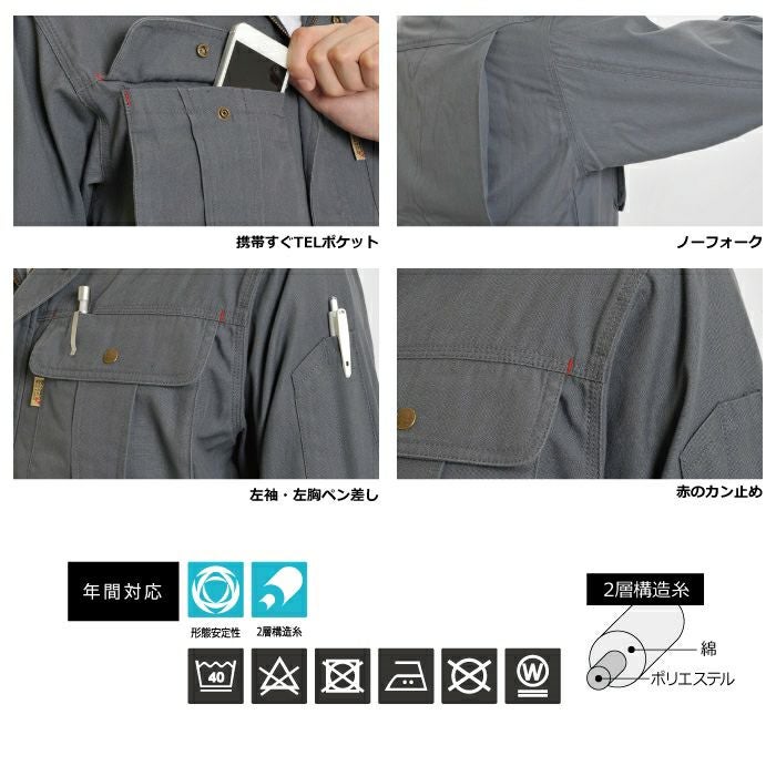 ●関連商品※8816ワークジャンパー※8815ワークシャツ※8809モバイルエプロン※8813カーゴパンツ※8811ワークパンツ●オールシーズン用●素材:チペア/チペアシーティング 綿70% ポリエステル30%●形態安定性、2層構造糸、携帯すぐTELポケット、ノーフォーク、左胸・左袖ペン差し、赤のカン止め●サイズ:S(着丈/74、肩巾/45、袖丈/54、胸囲/104)、M(着丈/76、肩巾/47、袖丈/56、胸囲/109)、L(着丈/78、肩巾/49、袖丈/58、胸囲/114)、LL(着丈/80、肩巾/51、袖丈/60、胸囲/119)、3L(着丈/80、肩巾/53、袖丈/60、胸囲/124)、4L(着丈/82、肩巾/55、袖丈/60、胸囲/129)、5L(着丈/82、肩巾/57、袖丈/60、胸囲/135)、6L(着丈/82、肩巾/59、袖丈/60、胸囲/141)●カラー:カーキ、ネイビー、オリーブ、オレンジ、スミクロ