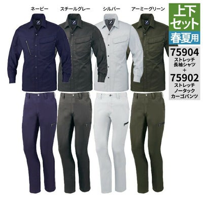 自重堂 作業服 上下セット 75904 ストレッチ長袖シャツ と 75902 ストレッチノータックカーゴパンツ SS-LL 春夏用 かっこいい おしゃれ 作業着