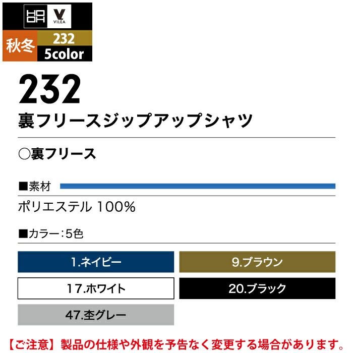 村上被服 HOOH 鳳凰 作業服 作業着 村上被服 HOOH 鳳凰 作業服 232 裏フリースジップアップシャツ M-3L