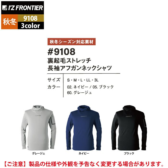 アイズフロンティア 作業服 作業着 作業ズボン アイズフロンティア 作業服 9108 裏起毛ストレッチ長袖アフガンネックシャツ S-3L 秋冬用