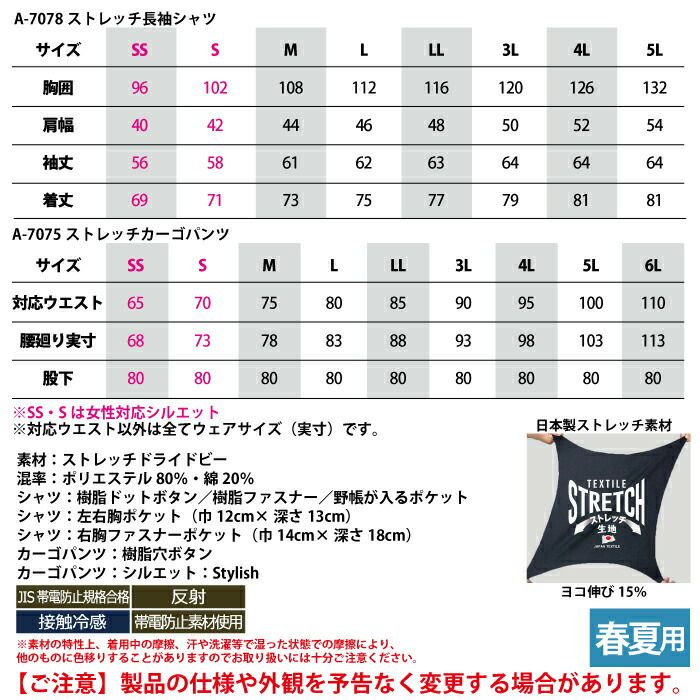 コーコス 作業服 作業着 作業ズボン コーコス 作業服 上下セット A-7078 ストレッチ長袖シャツM-3L と A-7075 ストレッチカーゴパンツ SS-3L 春夏用 かっこいい おしゃれ 作業着 ズボン