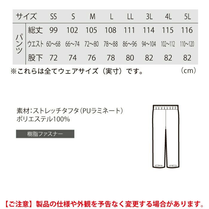 ◇機能:撥水加工。ウエストシャーリングの内側スピンドル仕様。パンツ裾は面ファスナーで調整可能。長靴の上からでもかぶせる事ができる裾巾。