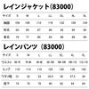 ●秋冬用●素材:タフタ(ポリエステル100%)●機能:フロント:樹脂ファスナー●83000レインジャケット●サイズ:S(胸囲/104、裄丈/83、着丈/74)、M(胸囲/108、裄丈/85、着丈/77)、L(胸囲/112、裄丈/87、着丈/80)、LL(胸囲/116、裄丈/89、着丈/83)、EL(胸囲/122、裄丈/92、着丈/86)、4L(胸囲/128、裄丈/95、着丈/89)、5L(胸囲/134、裄丈/95、着丈/89)●カラー:ネービー、ライトグリーン、レッド、チャコールグレー●83001レインパンツ●サイズ:S(ウエスト/68-76、ヒップ/110、ワタリ幅/31、股下/74)、M(ウエスト/76-84、ヒップ/114、ワタリ幅/32、股下/76)、L(ウエスト/84-92、ヒップ/118、ワタリ幅/33、股下/78)、LL(ウエスト/92-100、ヒップ/124、ワタリ幅/34.5、股下/80)、EL(ウエスト/100-106、ヒップ/130、ワタリ幅/36、股下/82)、4L(ウエスト/106-112、ヒップ/136、ワタリ幅/37.5、股下/84)、5L(ウエスト/112-118、ヒップ/142、ワタリ幅/39、股下/84)●カラー:ブラック