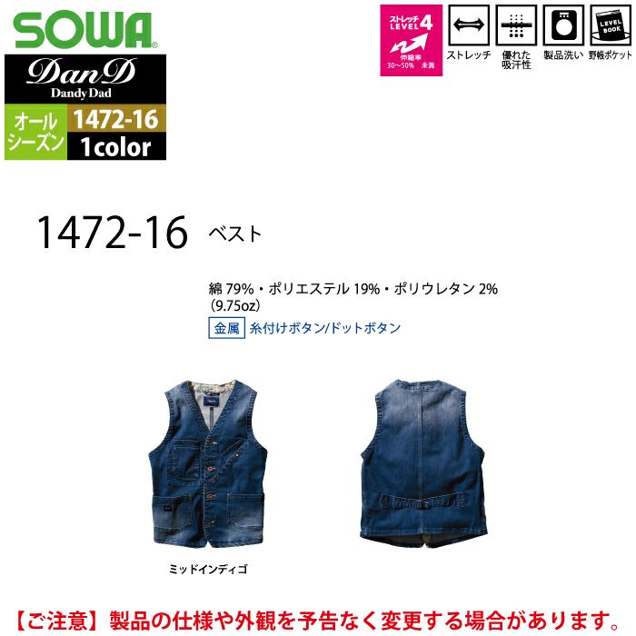 桑和 SOWA 作業服 作業着 作業ズボン 桑和 SOWA 作業服 1472-16 ベスト S-LL オールシーズン