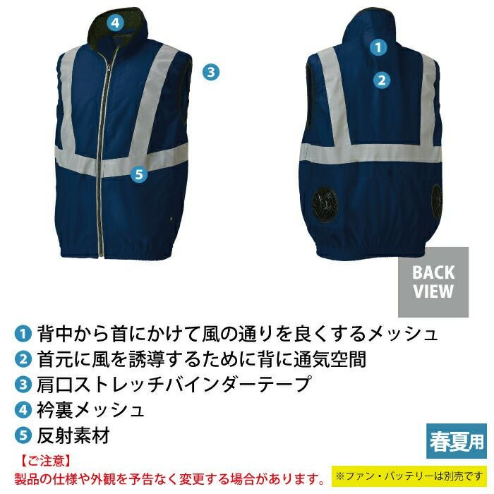 ◇機能:背中から首にかけて立体的に風の通りをよくするメッシュと衿裏メッシュ・首元に風を誘導するために背に通気空間。肩口はファンの風が漏れにくいストレッチバインダーテープ使用