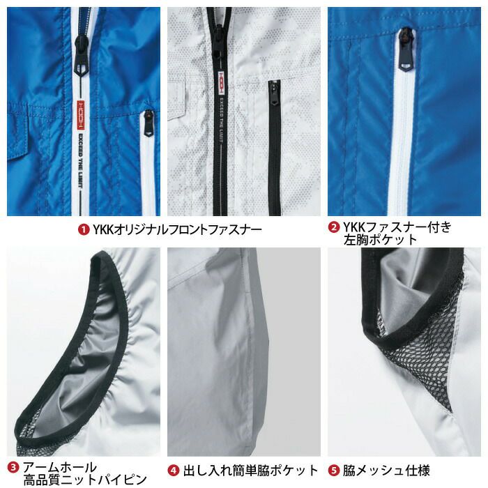 ◇機能:裏チタンコーティング・アームホール高品質ニットパイピン・出し入れ簡単脇ポケット・内側ペン差し・ファスナー付きバッテリーポケット・ケーブル止めマジックテープ・腰部保冷剤入れメッシュポケット・軽量プラスチック仕様のファスナーとボタン