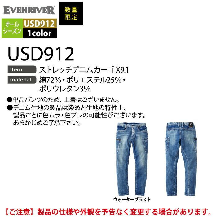 イーブンリバー 作業服 作業着 作業ズボン イーブンリバー EVENRIVER 作業服 作業ズボン USD912 ストレッチデニムカーゴX9.1 S-5L 春夏秋冬 作業着 おしゃれ