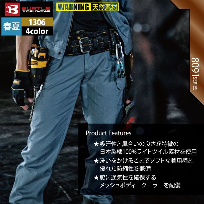 綿100%のシリーズ バートル BURTLE 作業着 作業ズボン 1306 ワンタックカーゴパンツ 105-115 作業服 春夏 ズボン