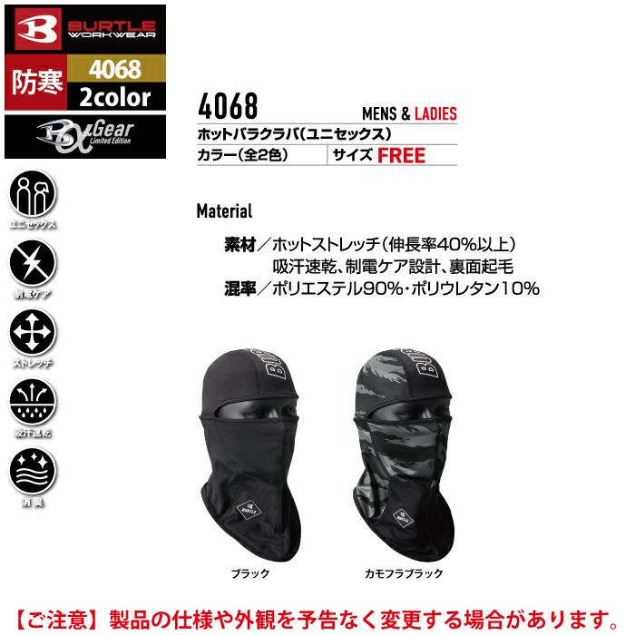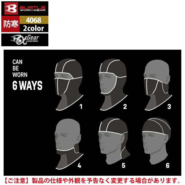 6通りの着用パターン可能 バートル BURTLE 作業着 インナー 4068 ホットバラクラバ 作業服 秋冬 防寒 ユニセックス ドライ 保温 目出帽