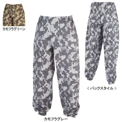 ●関連商品※10042ヤッケ●春夏用●素材:綿100% ●ウエストにゴム入り、サイドの空気穴、肌触りが良く吸湿性のある綿100% 素材●サイズ:F(ウエスト/~100、股下/82、わたり巾/38)、3L(ウエスト/~120、股下/82、わたり巾/41)、4L(ウエスト/~130、股下/82、わたり巾/44)●カラー:カモフラグレー、カモフラグリーン