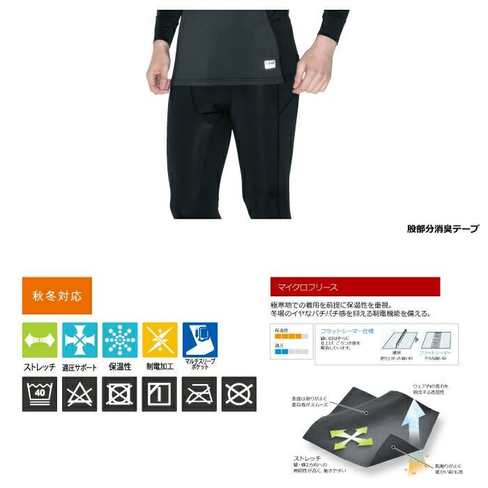 ●関連商品※8225ロングスリーブシャツ※8222ロングパンツ※8224腹巻付きロングパンツ●秋冬用●素材:マイクロフリース ポリエステル90% ポリウレタン10%●ストレッチ、適圧サポート、保温性、制電加工、股部分消臭テープ、フラットシーマー仕様●サイズ:S(身長/155~165、胸囲/68~76、股下/62.4)、M(身長/165~175、胸囲/76~84、股下/64.7)、L(身長/175~185、胸囲/84~94、股下/67)、LL(身長/175~185、胸囲/94~104、股下/69.3)、3L(身長/175~185、胸囲/104~114、股下/71.6)