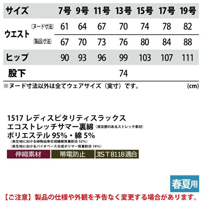 ジーベック XEBEC 作業服 作業着 作業ズボン ジーベック XEBEC 作業服 春夏用 1517 レディスピタリティスラックス 15号 作業着