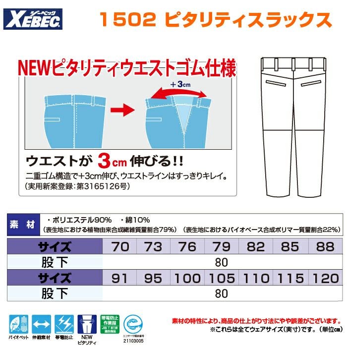 ジーベック XEBEC 作業服 作業ズボン 1502 ピタリティスラックス 70-100 秋冬 作業着