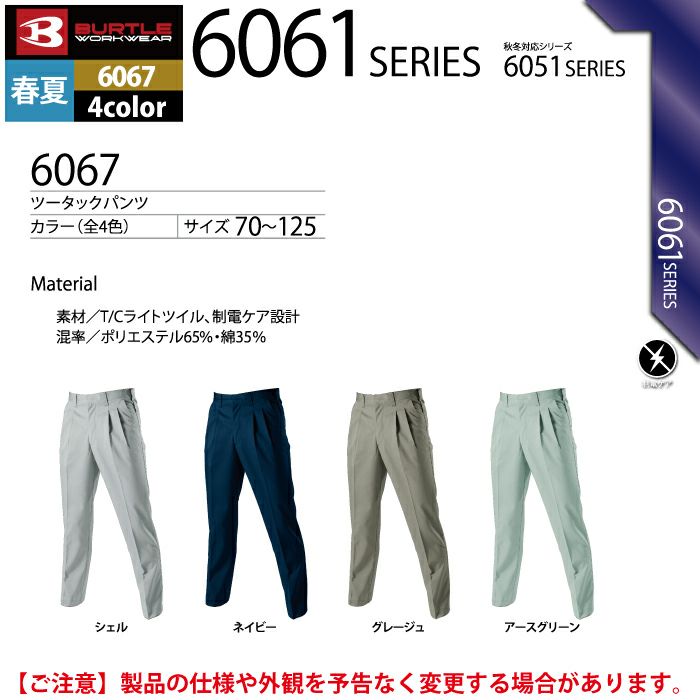 【keyword0323_workclothes】 作業着 作業服 パンツ ズボン スラックス バートル BURTLE 作業着 作業ズボン 6067 ツータックパンツ 70-88 作業服 春夏
