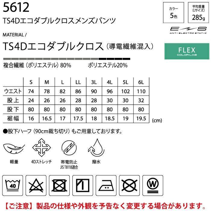 藤和 TSDESIGN 作業服 作業着 作業ズボン 藤和 TSDESIGN 作業服 オールシーズン 5612 TS4Dエコダブルクロスメンズパンツ S-LL